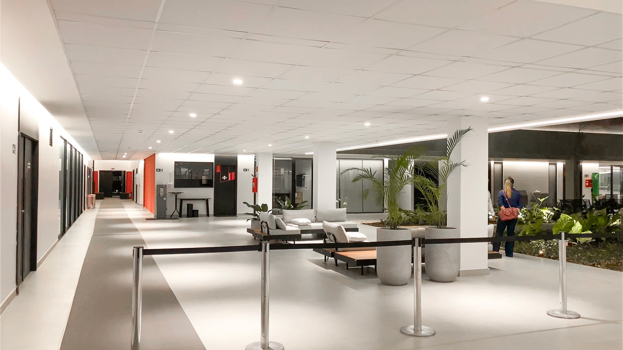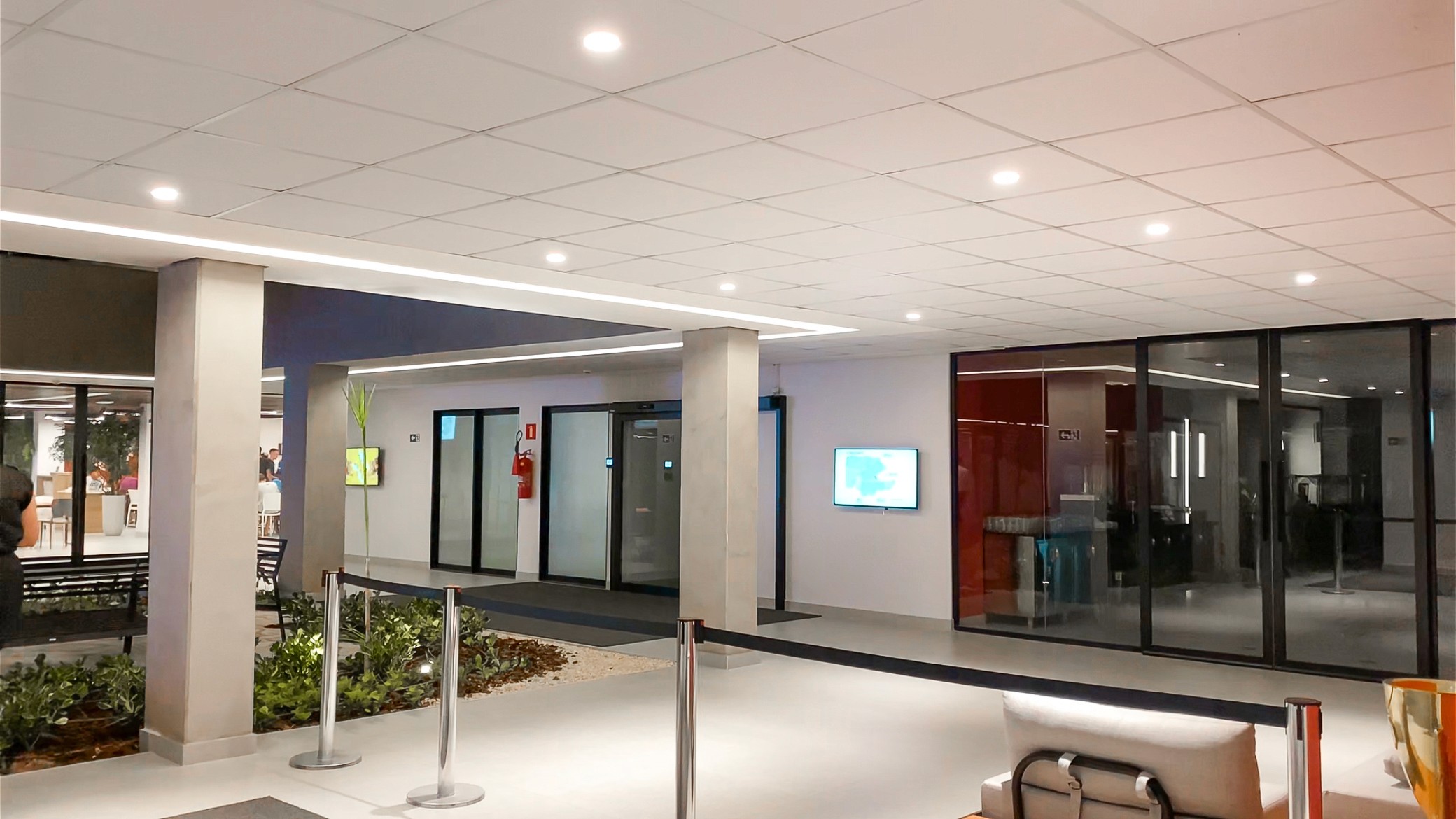 Os espaços de convivência foram desenvolvidos para proporcionar conforto e integração, com soluções em forros e paredes que contribuem para o desempenho acústico e a organização dos ambientes.