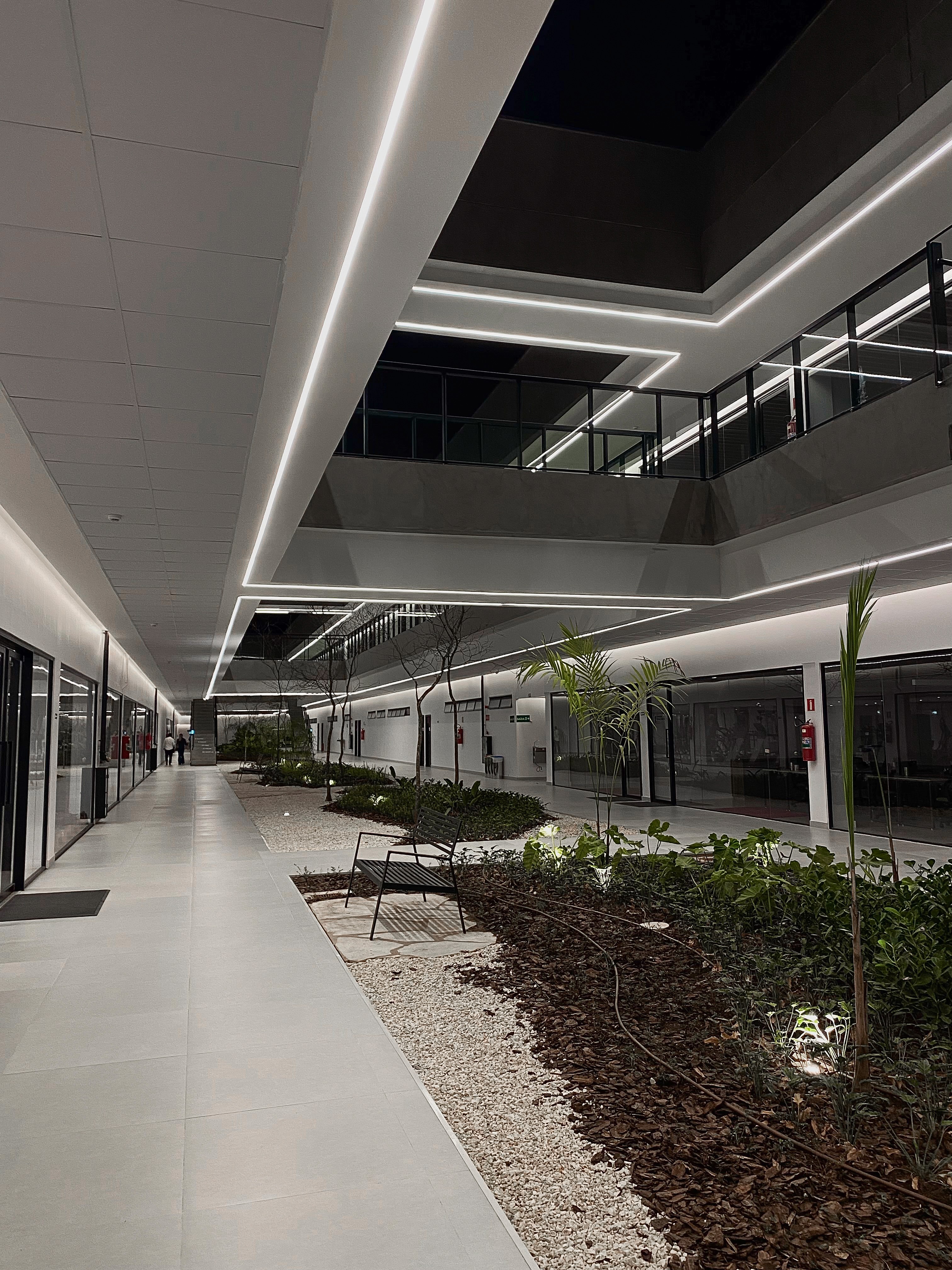 O uso de brises metálicos contribui para o controle solar, identidade visual e integração da arquitetura com o entorno, reforçando o caráter contemporâneo do empreendimento.