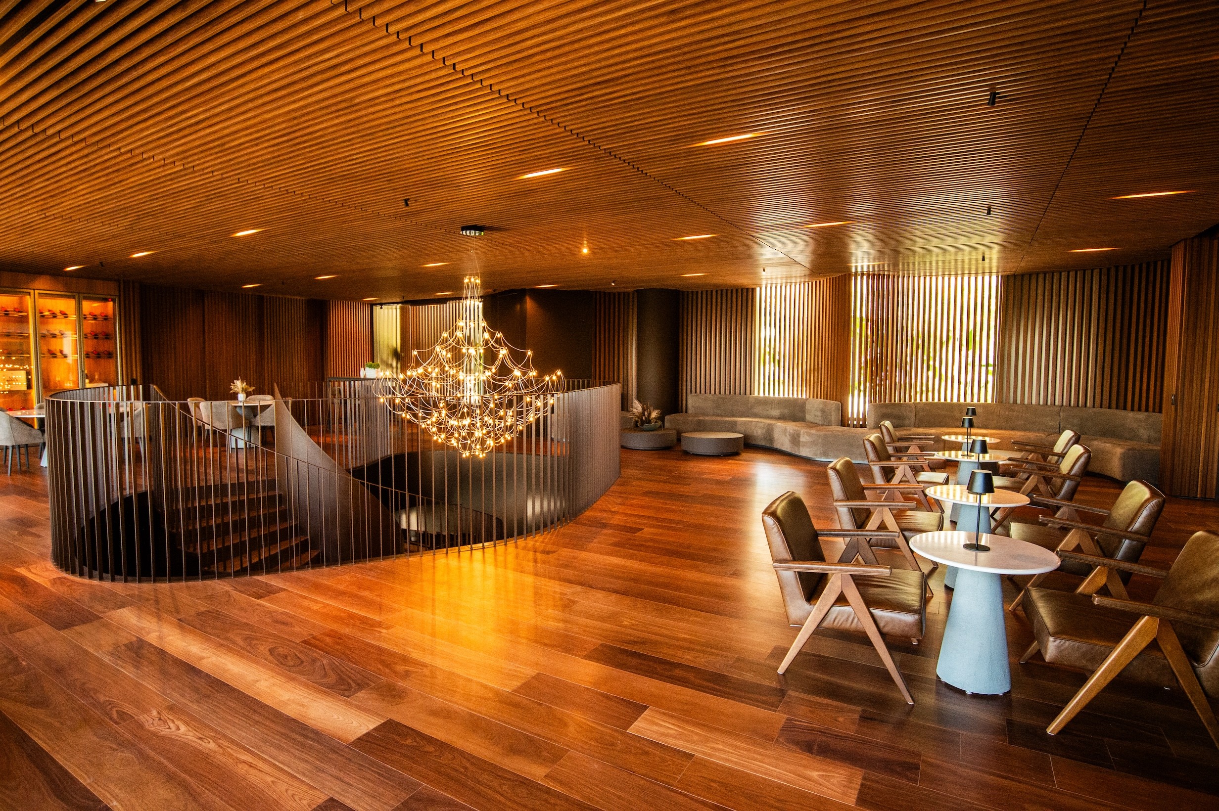 Aplicação de revestimentos acústicos Fiberwood, forros de madeira Nexalux na área do Wine Bar e forros especiais Owaplan, combinando desempenho acústico, estética sofisticada e soluções técnicas específicas para cada ambiente.